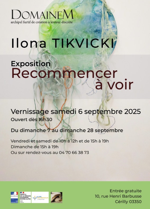 Actuellement en résidence de recherche & création au DomaineM à Cérilly dans l’Allier depuis le 9 août jusqu’au 7 septembre 2025. C’est un second mois d’août consécutif dans ce lieu, sur invitation de Michel Cegarra. J’y prépare un nouveau recueil de poésies et de textes réflexifs qui s’intitulera Habiter le doute et les œuvres de l’exposition Recommencer à voir qui s’ouvrira début septembre.