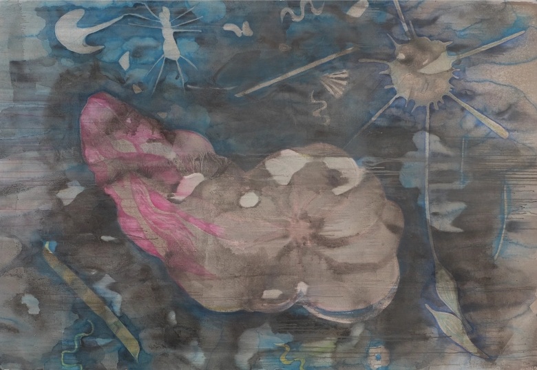 « Survivance des remous », aquarelle, gouache, encres végétales, travaillées sous la pluie, sur papier aquarelle grain torchon 300 gr, 115 x 164 cm, 2024.