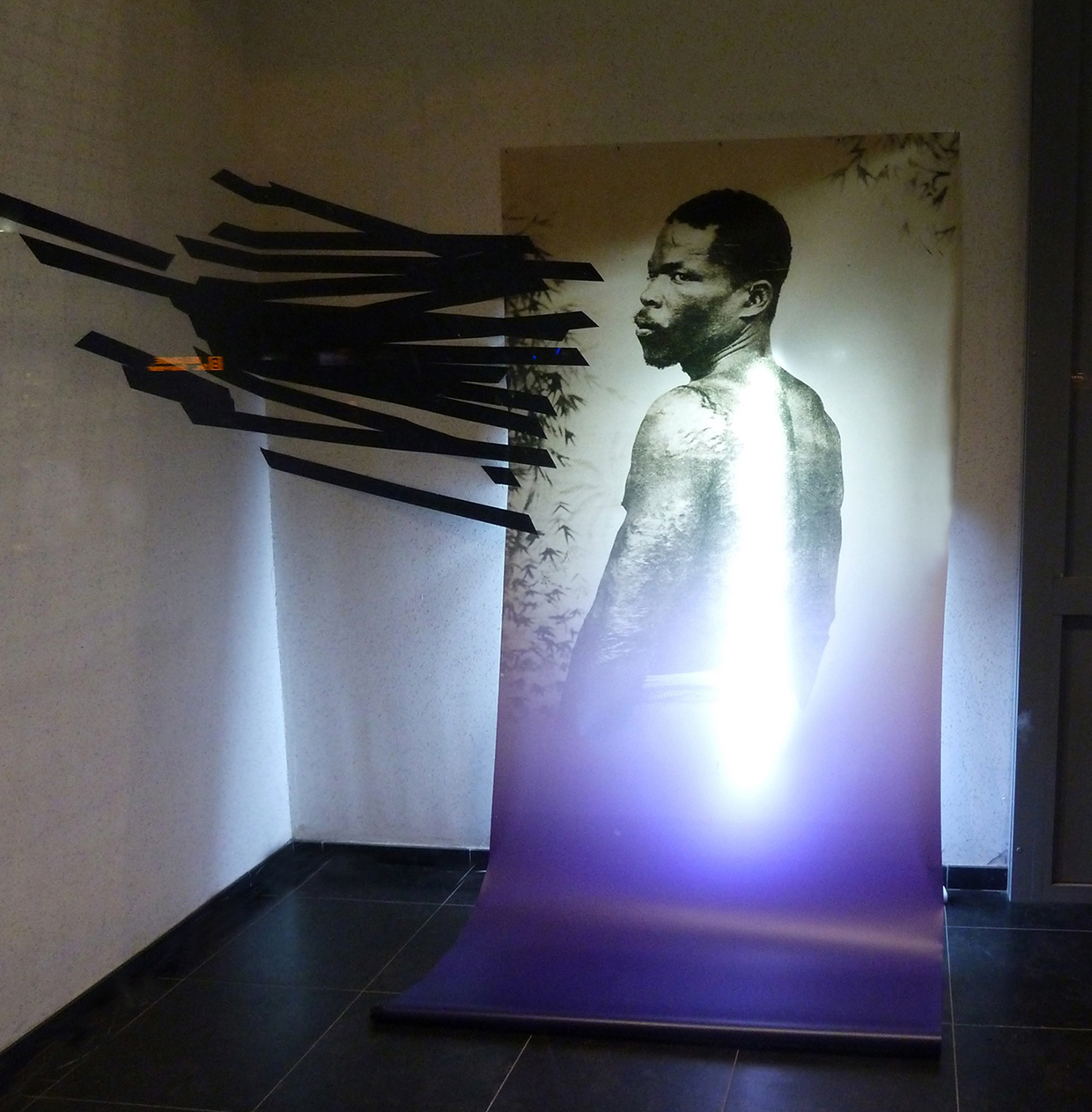 « Un vent violent », impression sur support backlight, néon, scotch noir, 2013, © Adagp.
