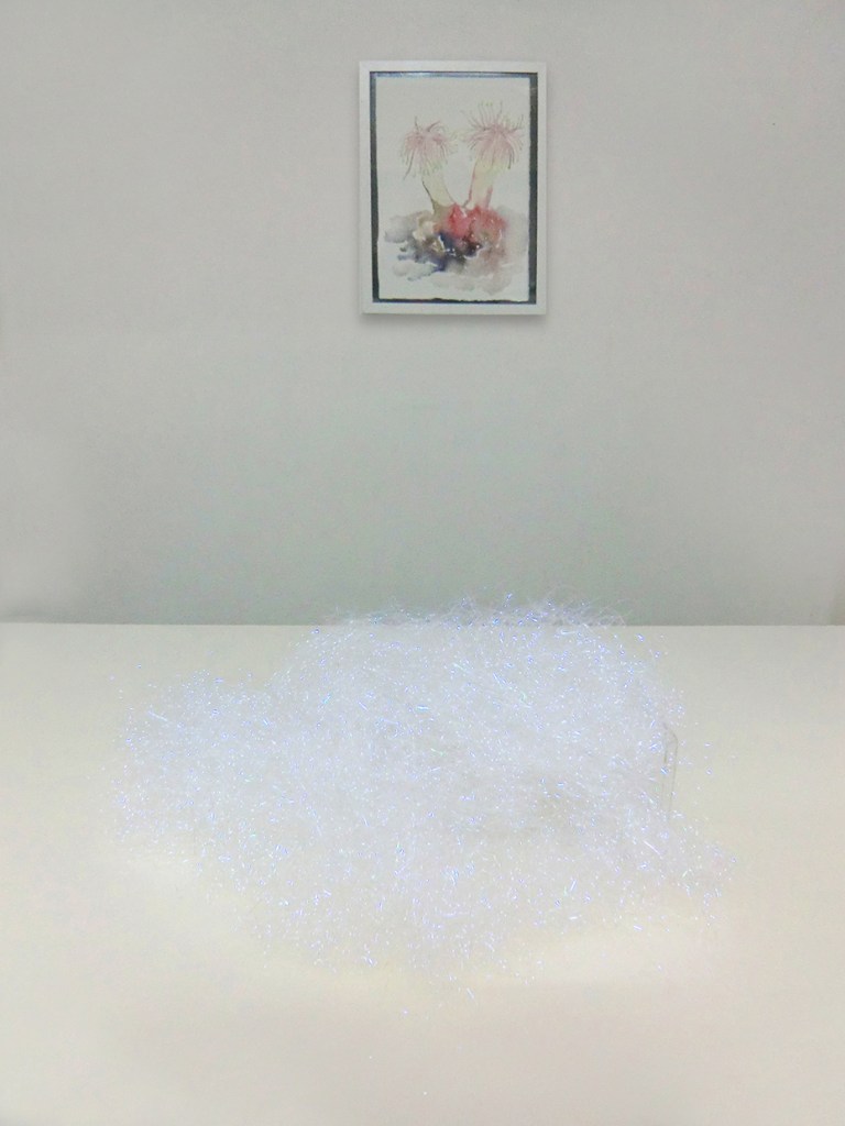 Au premier plan « Table d’observation », filament iridescents, boite pvc, 2011, © Adagp.