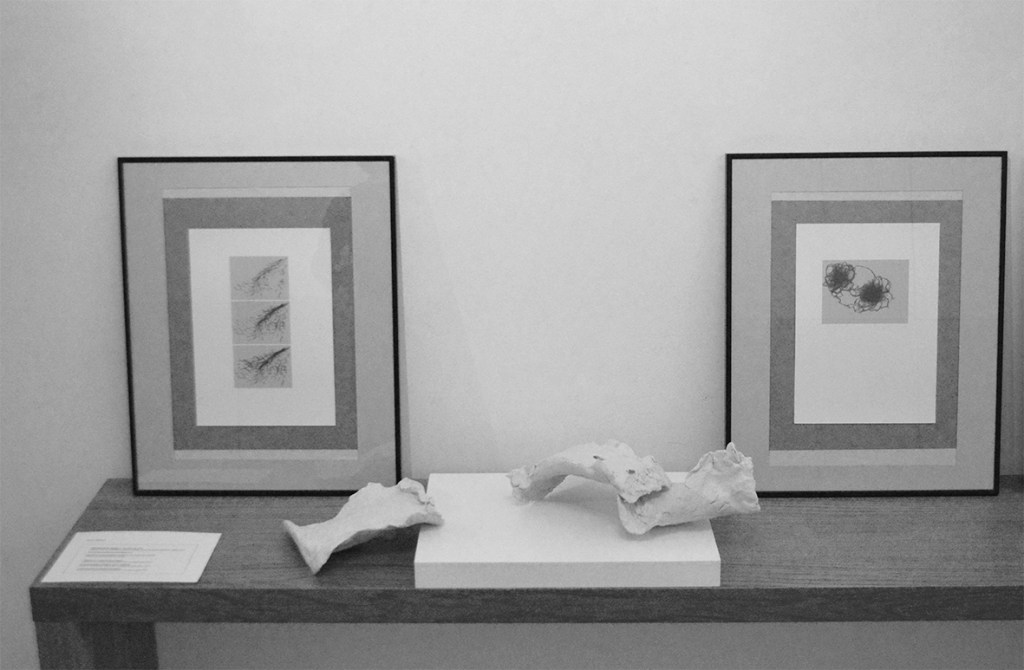 « Trauma crânien », plastiroc, socle, et 2 tirages de dessins numériques, 2014, © Adagp.