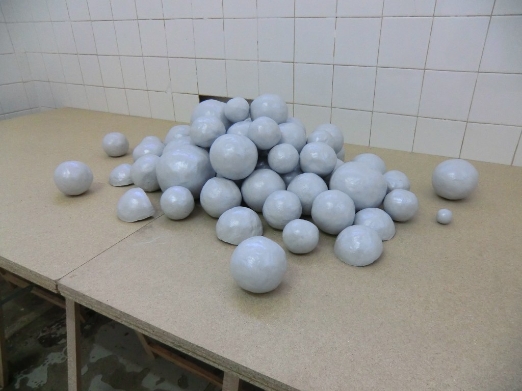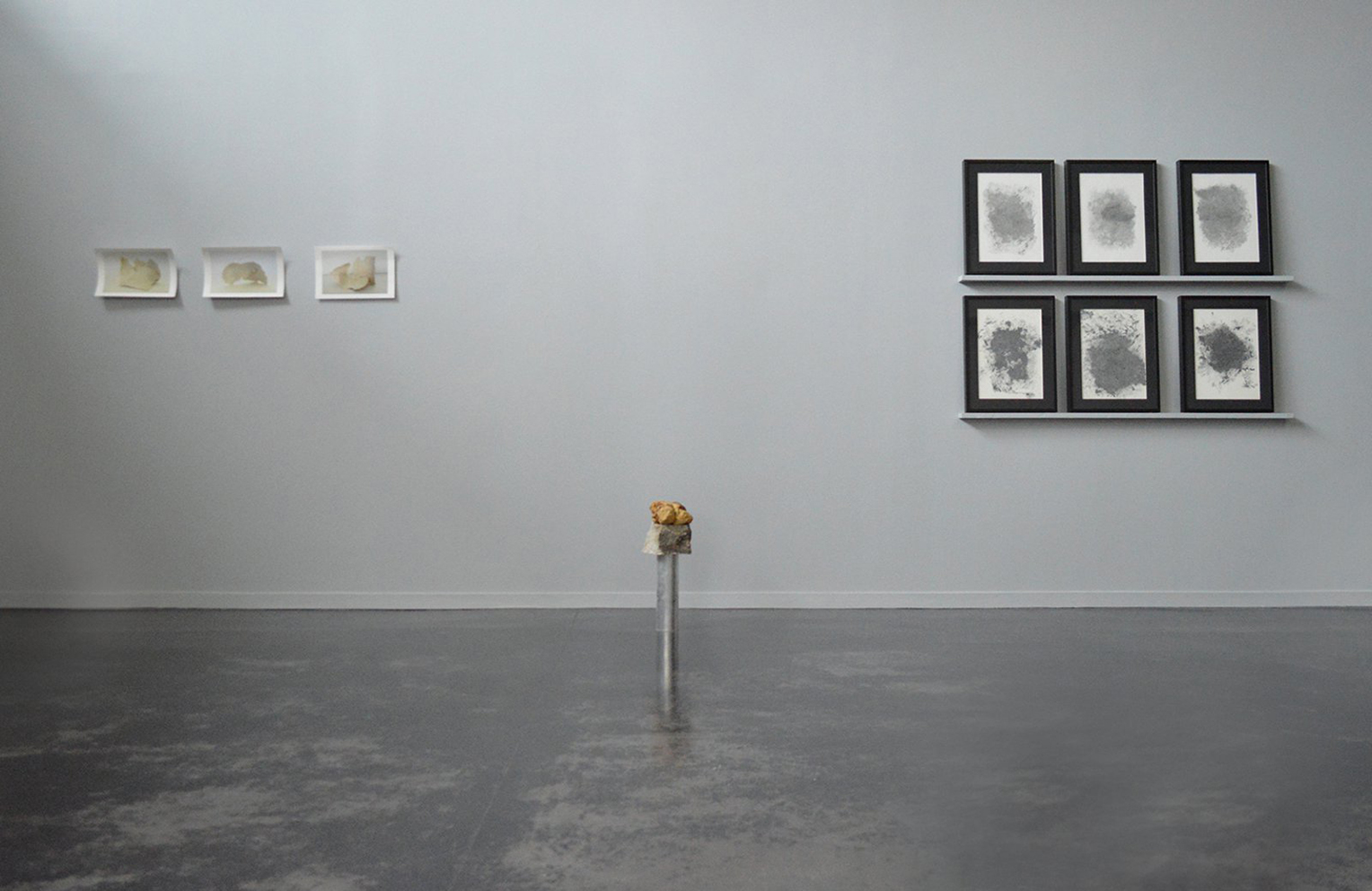 La proposition « Le rôle de la plasticité cérébrale (…) » explore les influences extérieures sur l’être humain, l’animal de mer et la matière. L’adaptabilité au milieu, les stratégies de fuite, font partie des recherches esthétiques. Le titre ici pourrait être celui d’un manuel de recherche en neurologie, mais le «trauma de Pschiiit» n’existe pas. Ce qui est nommé, non sans humour, semble être le caractère inactinique de la douleur, un indice sur le point de vue en contre-plongée depuis lequel le cobaye apparemment destitué de son jugement redouble d’attention, décuple son acuité perceptive et la conscience de sa position pour innover en stratégies de survie glissantes. Là où le souvenir est édulcoré par les mots, la forme parle, la matière et les contours rendent compte des influences et des pressions à l’instar de ces pierres, de ces ossements qui révèlent l’origine du monde.